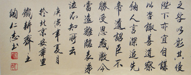陶仁志 陶仁志,1947年生,安徽合肥人。著名书法家、安徽书协理事。少时酷爱书法,以地为纸,以指为笔,从魏碑、“二王”入手,深研传统,师法自然,五十多年学习积累,融汇古今,实践觉悟,自成面目,中年时即成为著名书法家。楷、行、草、隶,四体皆擅。尤以楷、行功力最深,成功最早。楷书质朴高古,清健脱俗;行书婉转流畅,气韵兼备;草书大气磅礴,天趣横生;隶书沉着雄健,浑穆飘逸。偶作榜书也行险势稳,雅俗共赏。 其作品被中南海、人民大会堂、广东省博物馆、中国体育博物馆、北京奥组委、上海虹桥国际机场、中国人民大学、北京师范大学等单位和国内外知名人士收藏。1984年还发明了“以铁为墨,以锤为笔,具有中国书法特色的‘铁字书法’艺术作品”,1993年被联合国教科文组织授予“工艺美术家”称号。其艺术成就入编《全国现代书法家名家名人录》、《中国人物年鉴》、《中国群众文化辞典》、《世界艺术家名人录》、《中日现代美术通鉴》等辞书。被多家媒体专题报道。2008年11月29日,陶仁志先生艺术馆在长丰开馆。 |
